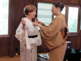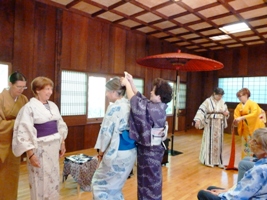Kimono wearing. Next, three volunteers dressed in kimonos with the help of our hostesses. Kimonos are robes worn so that the hem falls to the ankle with long, wide sleeves. They are wrapped around the body with the left side over the right and secured by a sash called an obi, which is tied at the back. The rest of us watched the colorful display of clothes, the skill of securing the obi, and happy faces of the volunteers displaying their elegant clothing.